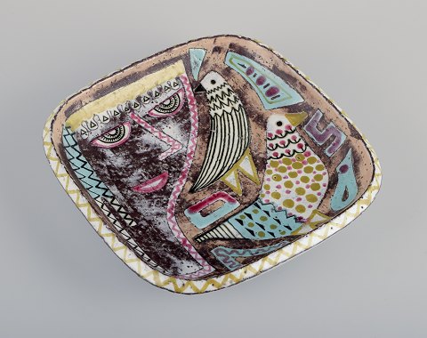 Polykrom glasur. Motiv kvindeansigt og fugle.
