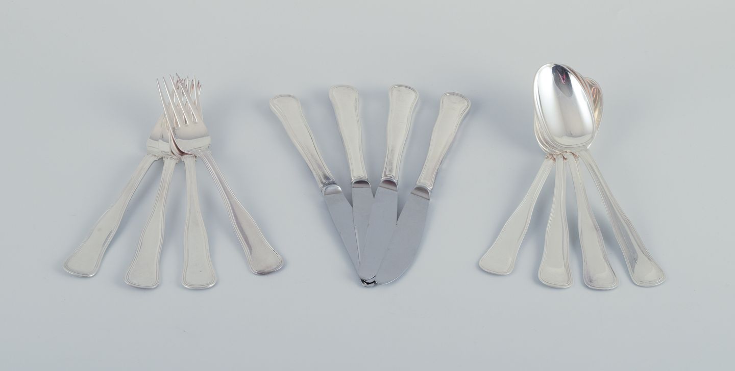 Cohr, Danish silversmith. "Old Danish". Complete four-person lunch service consisting of four lunch knives, four lunch forks, and four spoons in 830 silver.