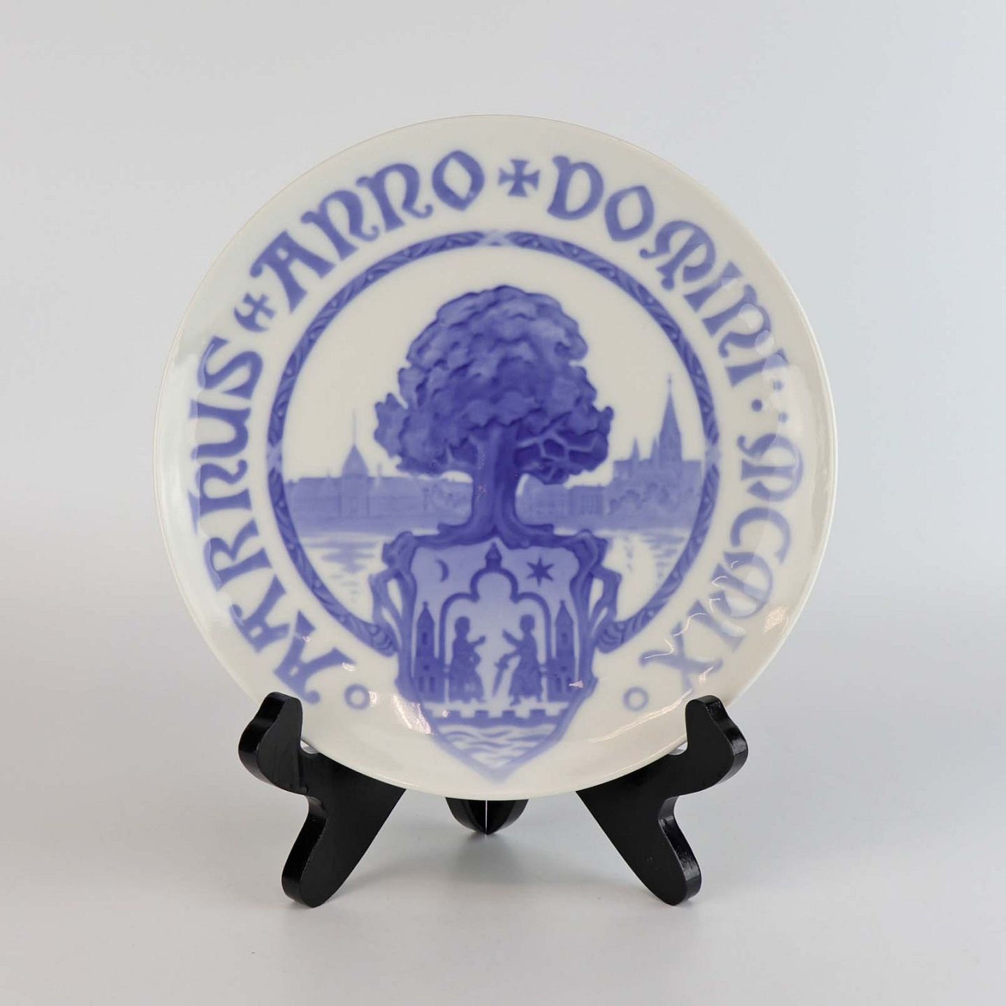 Platte i porcelæn med motiv af Aarhus byvåben og teksten Aarhus anno Domini Mcmix