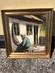 Johannes Lange, Oliemaleri på lærred af fisker der bøder (ordner) garn foran sit hus. Mål med ramme 56x61 cm