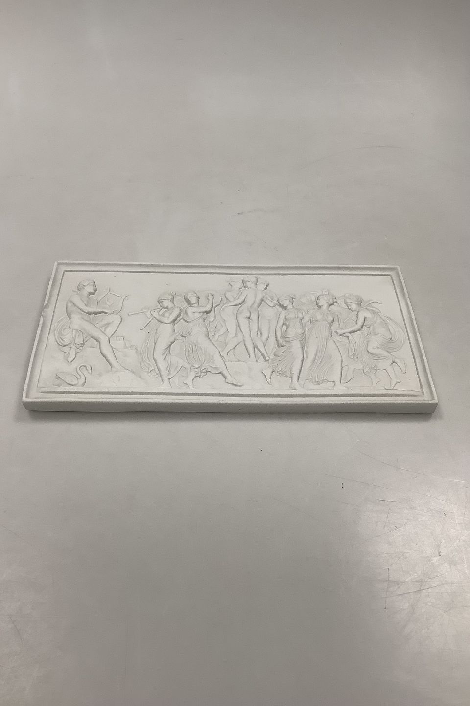 Bing og Grøndahl Bisquit "Musernes dans på Helikon". Kopi af relief modelleret i Rom i 1816. Måler 12,3 cm x 24,8 cm. Et afslag i venstre side og højre side mit på. se billeder.