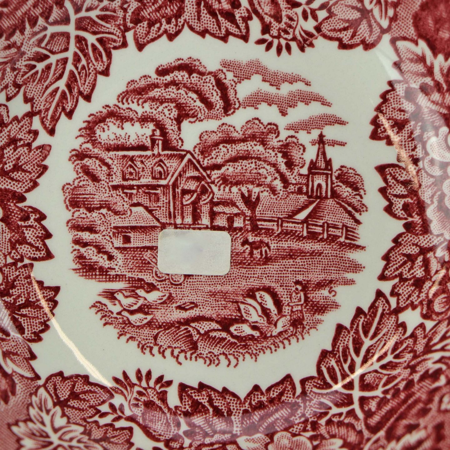 Rød Paris er af engelsk fajance dekoreret med forskellige landskaber og blomster i kanten, alt i forskellige røde nuancer