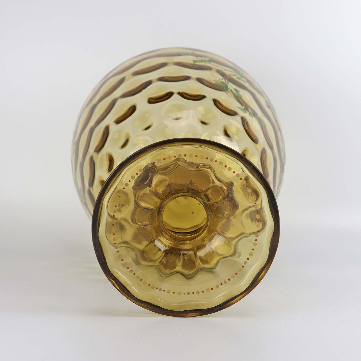 Ældre punch bowl i brungul struktureret glas med låg og øseske i pletsølv. Bowlen er dekoreret med malet motiv af ranker af vindruer og to børn