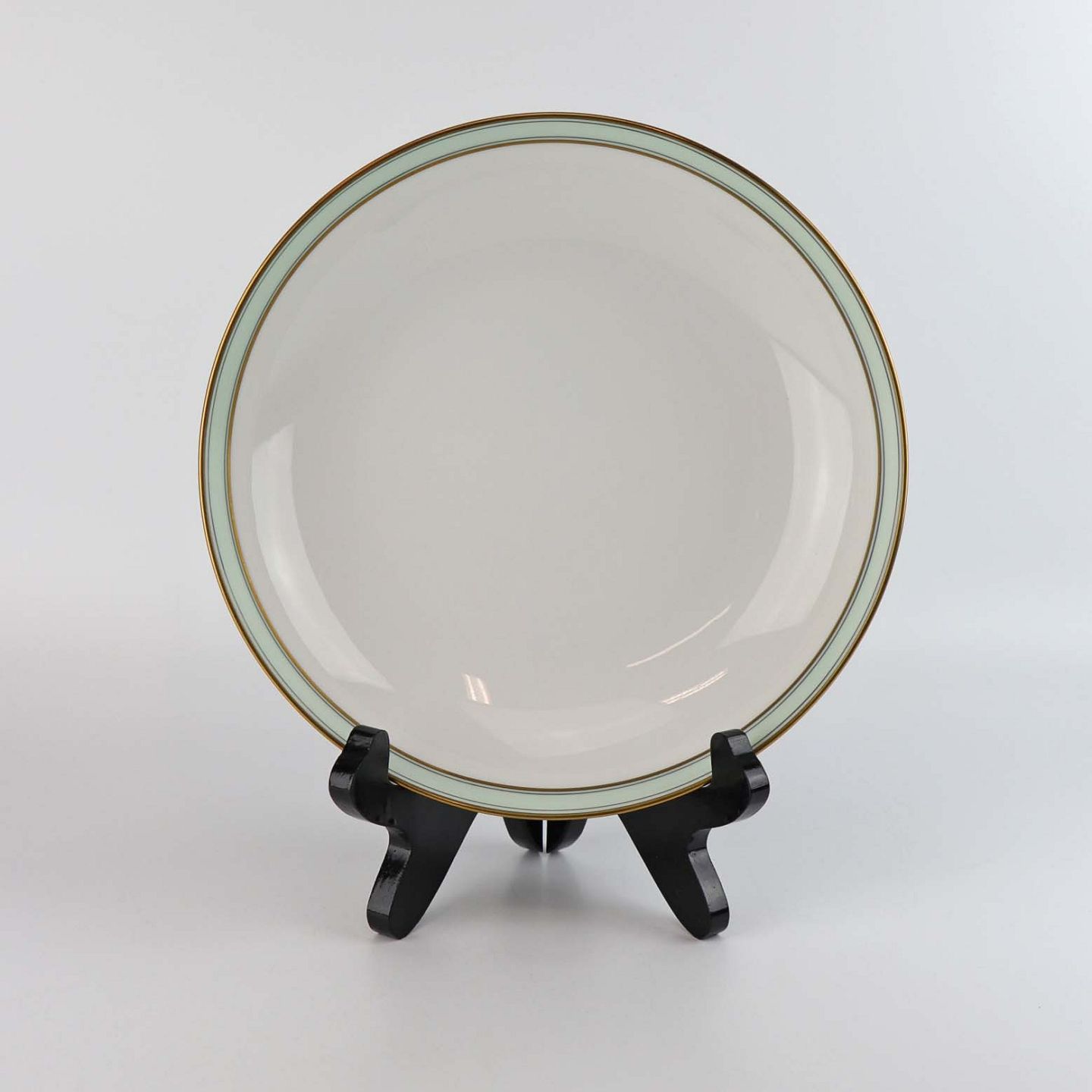 Service i glat hvidt porcelæn med mintblå dekoration og dobbelte guldkanter