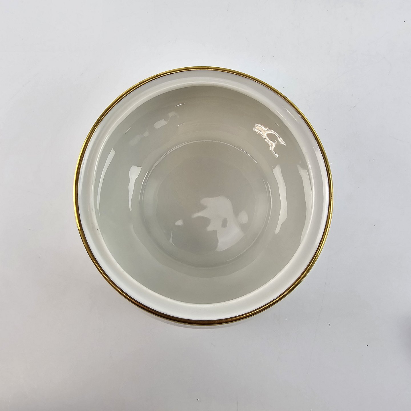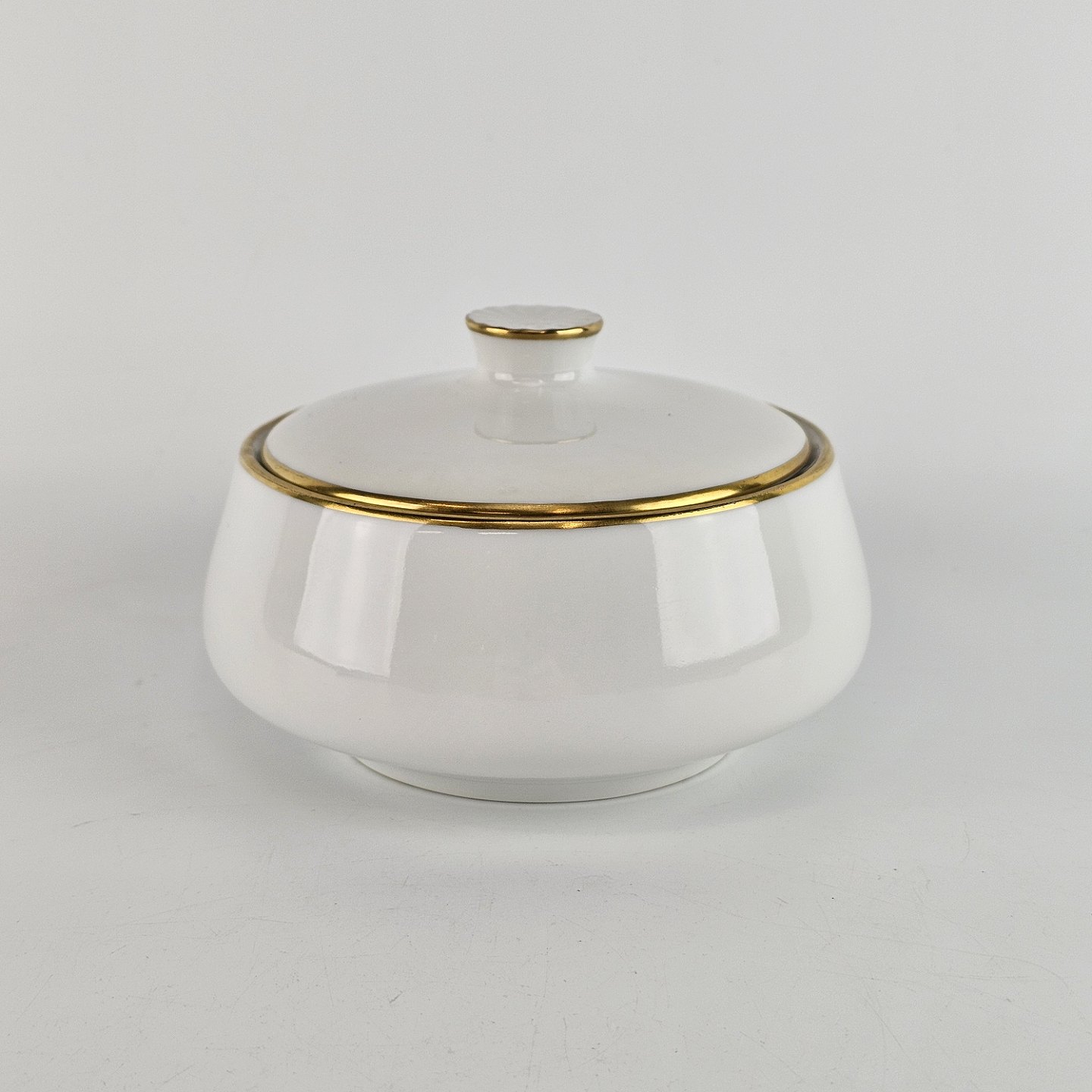 Vega er hvidt porcelæn med guldkant. Tallerkener og fade er dekoreret med riller i kanten. Kan fremstår med brugsspor