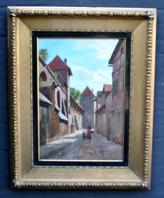 Fischer, August (1854 - 1921) Denmark: Street scene, Nuremberg, Germany. Oil on canvas. Signed: Aug. F. Nuremberg 15 - 7 - 1892. 60 x 41 cm.