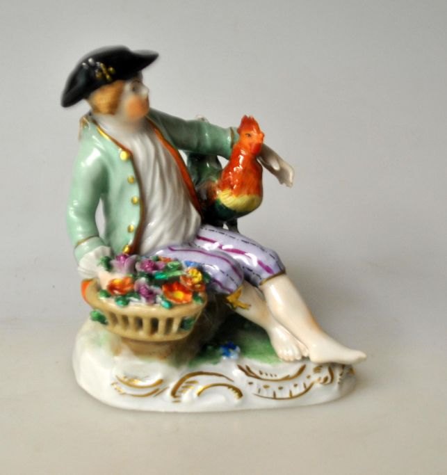 Porcelains figur af bondedreng med høns, Potschappel, Dresden, Tyskland. 20. årh. Bemalet og forgyldt. H: 11 cm. B: 6 cm. L: 9,5 cm. Stemplet: SP Dresden 5908D.