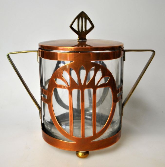 Kiksespand i kobber/messing, ca. 1900. Tyskland. Indvendig med glas. H.: 19 cm. B.: 20 cm. Dia: 11 cm.