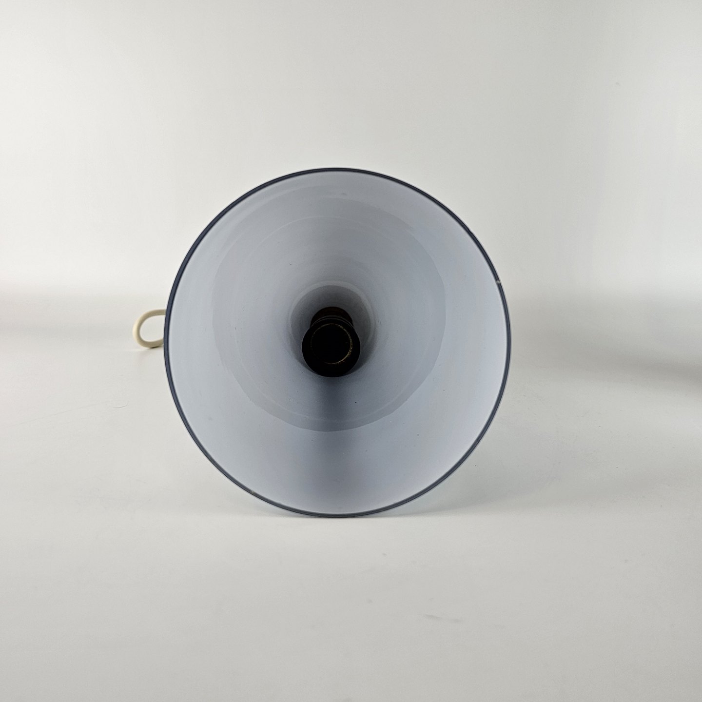 To lys blå kegleformet lamper af mundblæst glas. Top af teaktræ