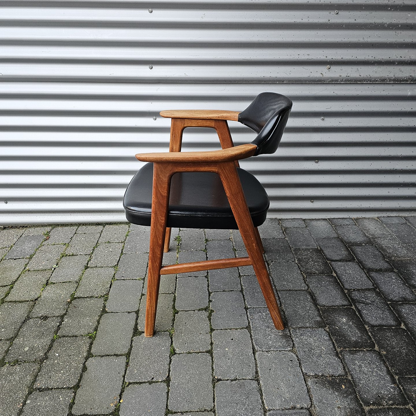 Armstol med stel i teaktræ og letpolstret ryg og sæde betrukket med sort nappa