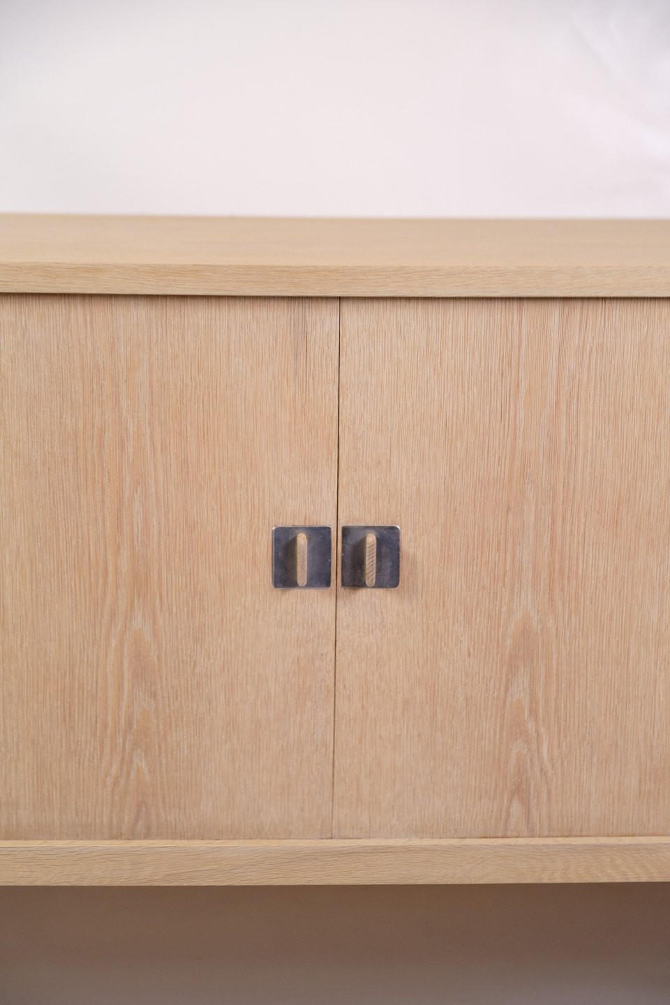 Oak sideboard designed by Hans J. Wegner of the model RY-25 manufactured in the 1960s. The Danish furniture designer Hans J. Wegner and his designs are produced all over the world and it all started in a television debate in the 1960s with Kennedy and Nixon and subsequently published in Interiors Magazine in the 1950s. The Wegner sideboard is made of oak with aluminum legs and handles.