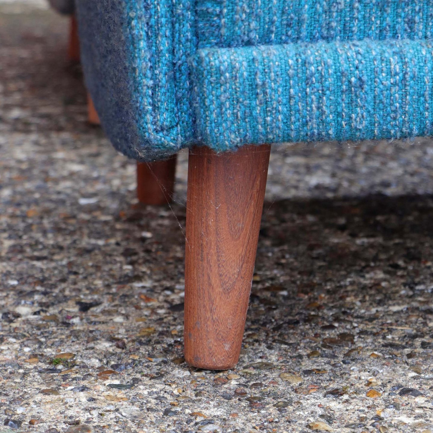 Et sæt med en lav lænestol og en højrygget lænestol. Stolene er betrukket med meleret turkis uldstof og har ben af matlakeret teaktræ