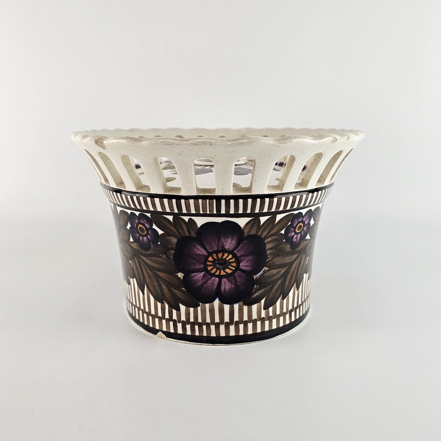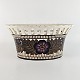 Oval jardiniere med låg i fajance. Blomsterskålen er med brun og lilla dekoration på en lys baggrund. Nr. 863/720