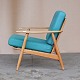 Lænestol med stel i lakeret bøgetræ og hynder betrukket med grøn uldstof.