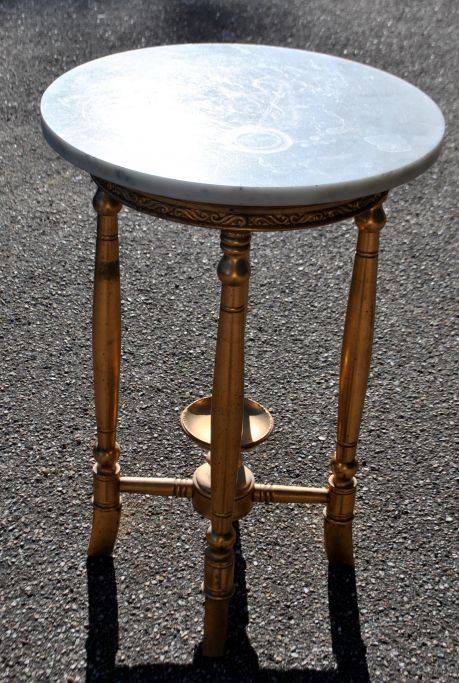 Forgyldt bord med marmorplade, ca. 1900. Danmark. På fire ben med midterparti. Ornamenteret på sarg. Hvid marmor plade. H.: 63 cm. Dia plade: 43 cm.