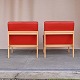 Et sæt lænestole med stel i lakeret egetræ og hynder betrukket med orangerød læder
