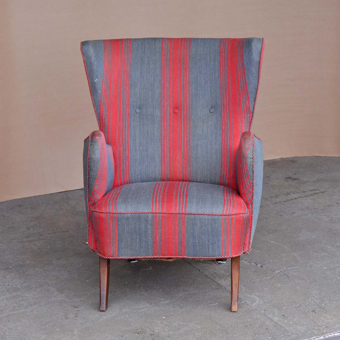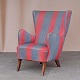 Ældre lænestol med springfjeder sæde og ben af mørk lakeret træ. Stolen er betrukket med gråt og rød stibet stof