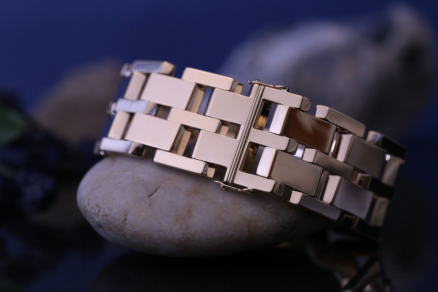 Blok guldarmbånd med 5 rækker i 14 karat massivt guld. Armbåndet er designet og produceret i Danmark, og det klassiske design er tidløst og elegant. Dette armbånd er bredt, og fylder godt på håndleddet. Derfor vil det være velegnet til særlige lejligheder.