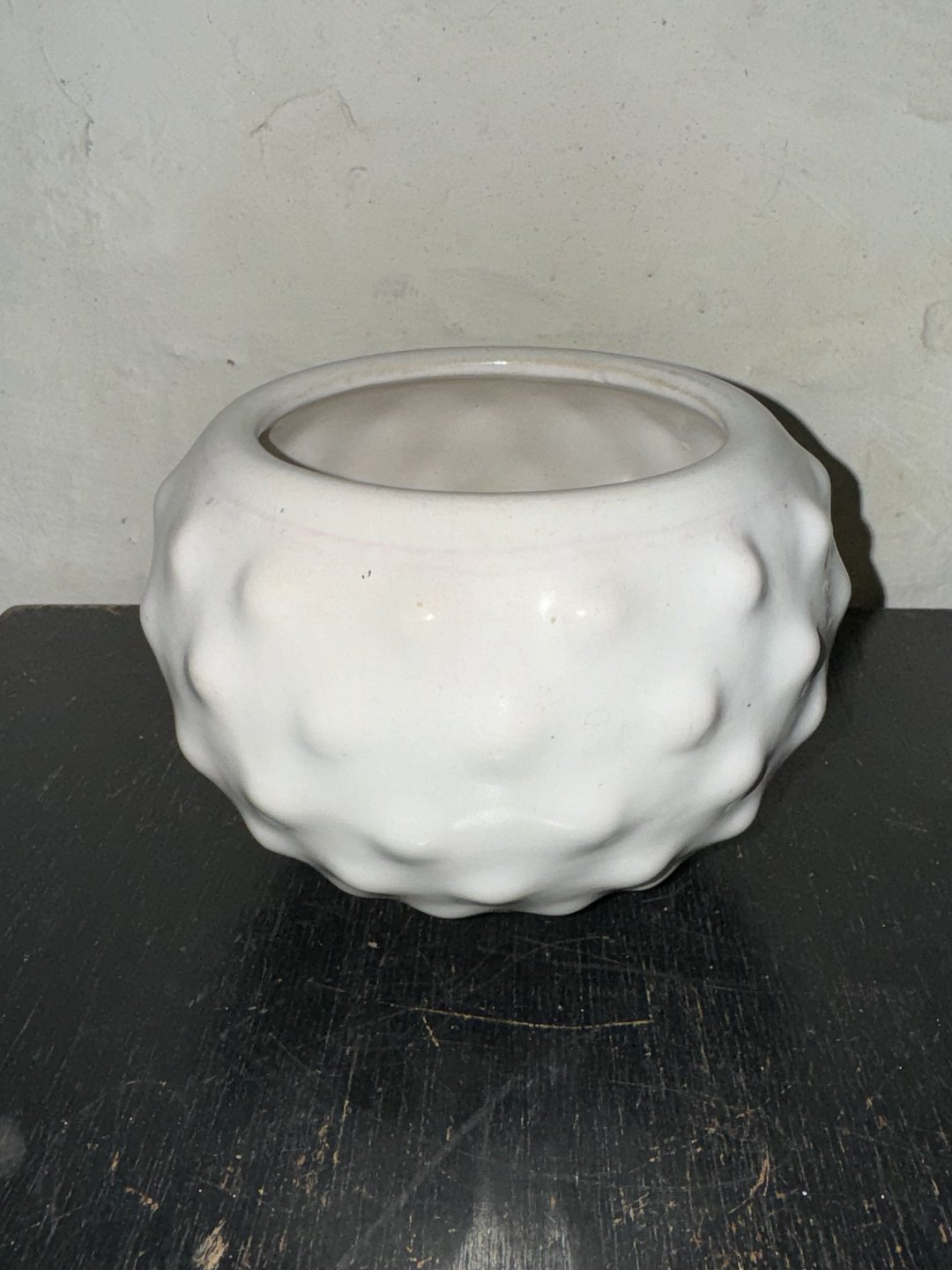 Vase i keramik fra Michael Andersen & Søn. Hvisglaseret og med knoppet dekoration rundt om skålen. I god stand. Alm. brugsspor efter brug indvendigt. Fabriksmærket på bunden. H. 11 cm Diameter på 15 cm