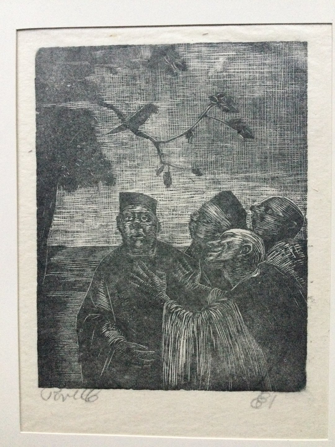 Træsnit på japanpapir monteret i passepartout.