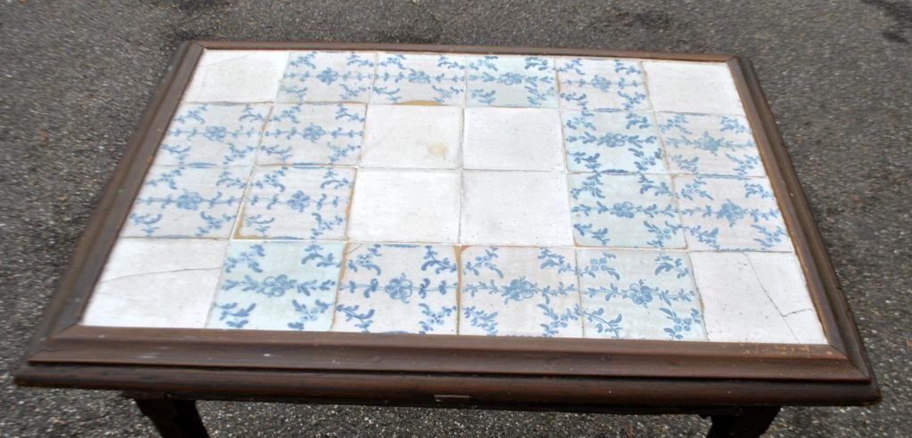 Sjældent originalt brun bemalet flisebord, Louis XVI, 1780, Danmark. Med tilspidsede ben. Med 16 fantastisk sjældne blåmalede ornament fliser med blomster og ranker fra Morsø Fabrikken i mønster. Herudover 8 helt hvide fliser fra samme periode - antagelig fra - København. Det hvide fliser sidder som et firpas i midten og en i hvert hjørne. H.: 70 cm. L.: 89 cm. D.: 62 cm.  Proveniens: En gammel stor bindingsværksgård i Hårmark på Samsø. Bordet fremstår originalt - dog med restaureringer, bl.a. med beslag på kanten. Oprindelig har der været en skuffe i den ene ende og udtrækkelige bakker i hver sin ende. De 4 hvide fliser i hjørnene er med defekter.