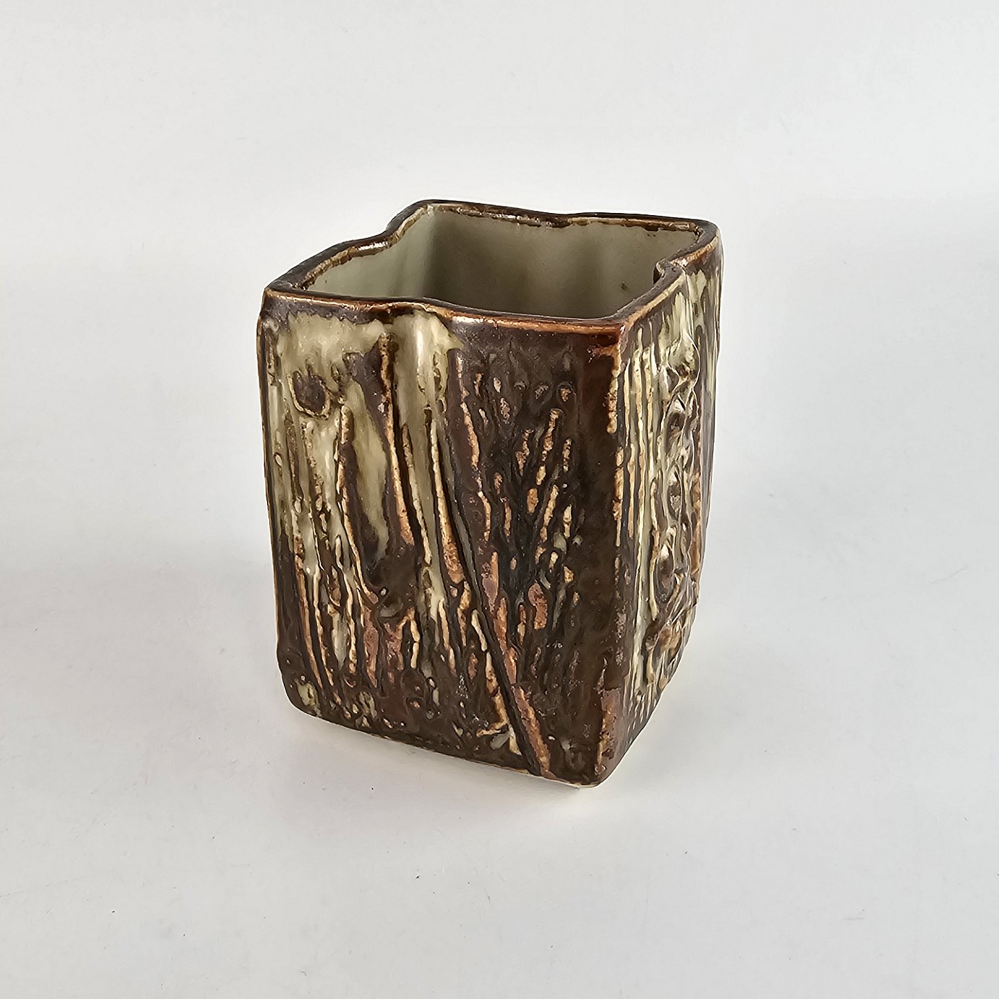 Lille brun firkantet krukke i stentøj.