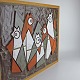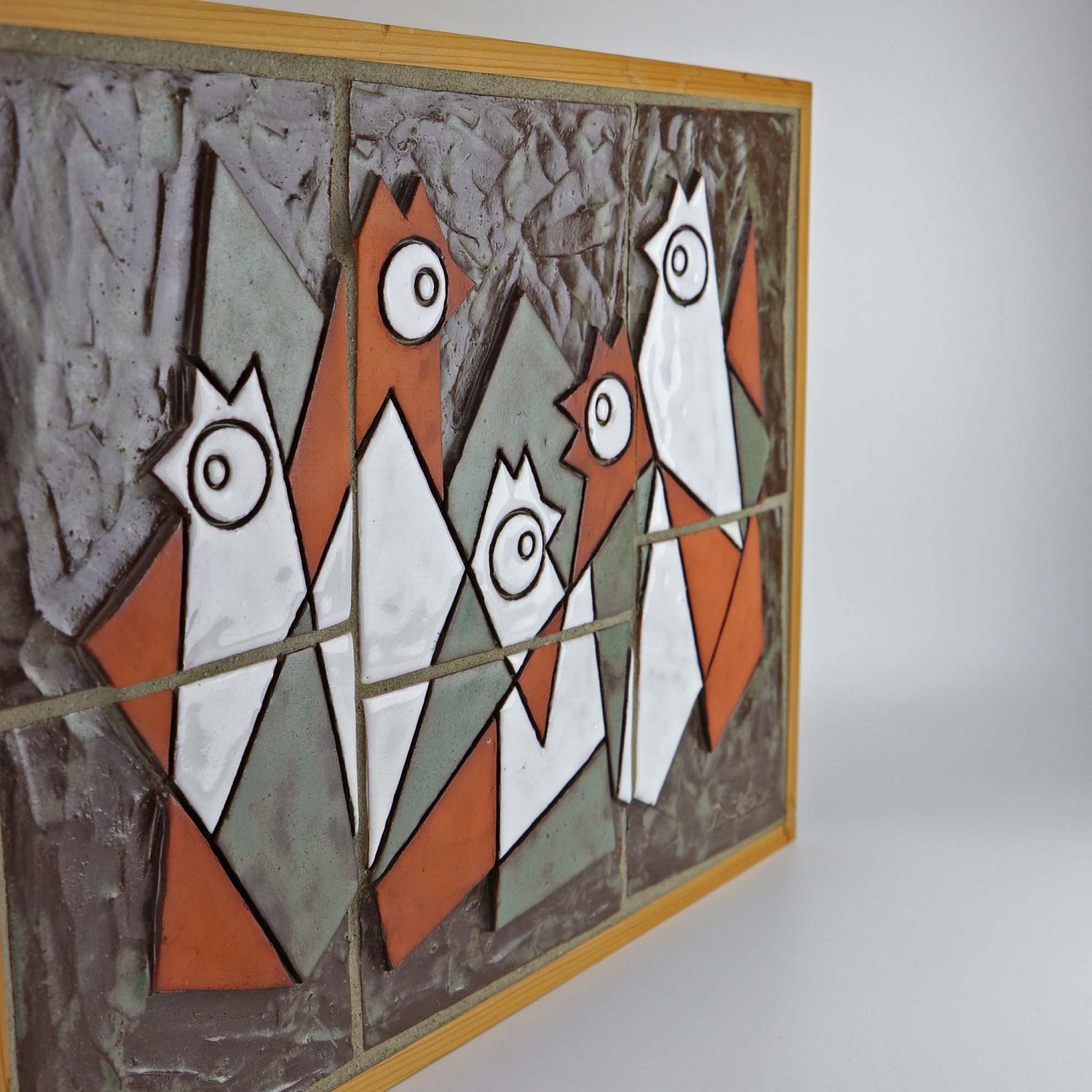 Relief i stentøj omgivet af træramme i fyrtræ med motiv af hvide, orange og grønne høns på brun baggrund