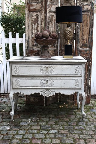 Decorative, old chest of drawers with fine details in Gustavian gray color with black and gray checks on the top...