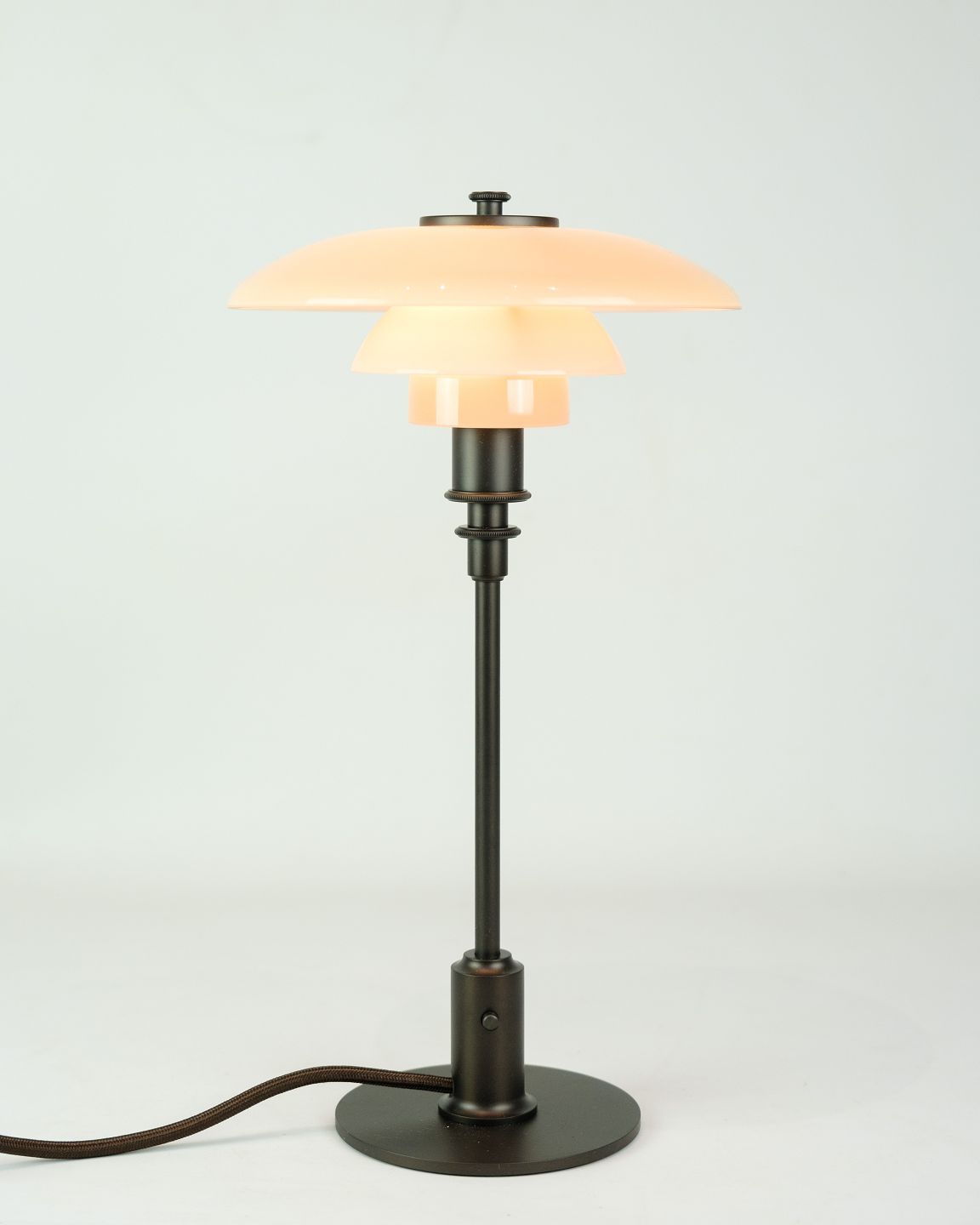 The exclusive PH 2/1 table lamp is a limited edition from Louis Poulsen, designed by Poul Henningsen. The lamp is equipped with mouth-blown, four-layer glass shades in a unique Dusty Terracotta color, which creates a warm and inviting atmosphere. The frame is made of lacquered, aged brass, which gives a refined and timeless expression.