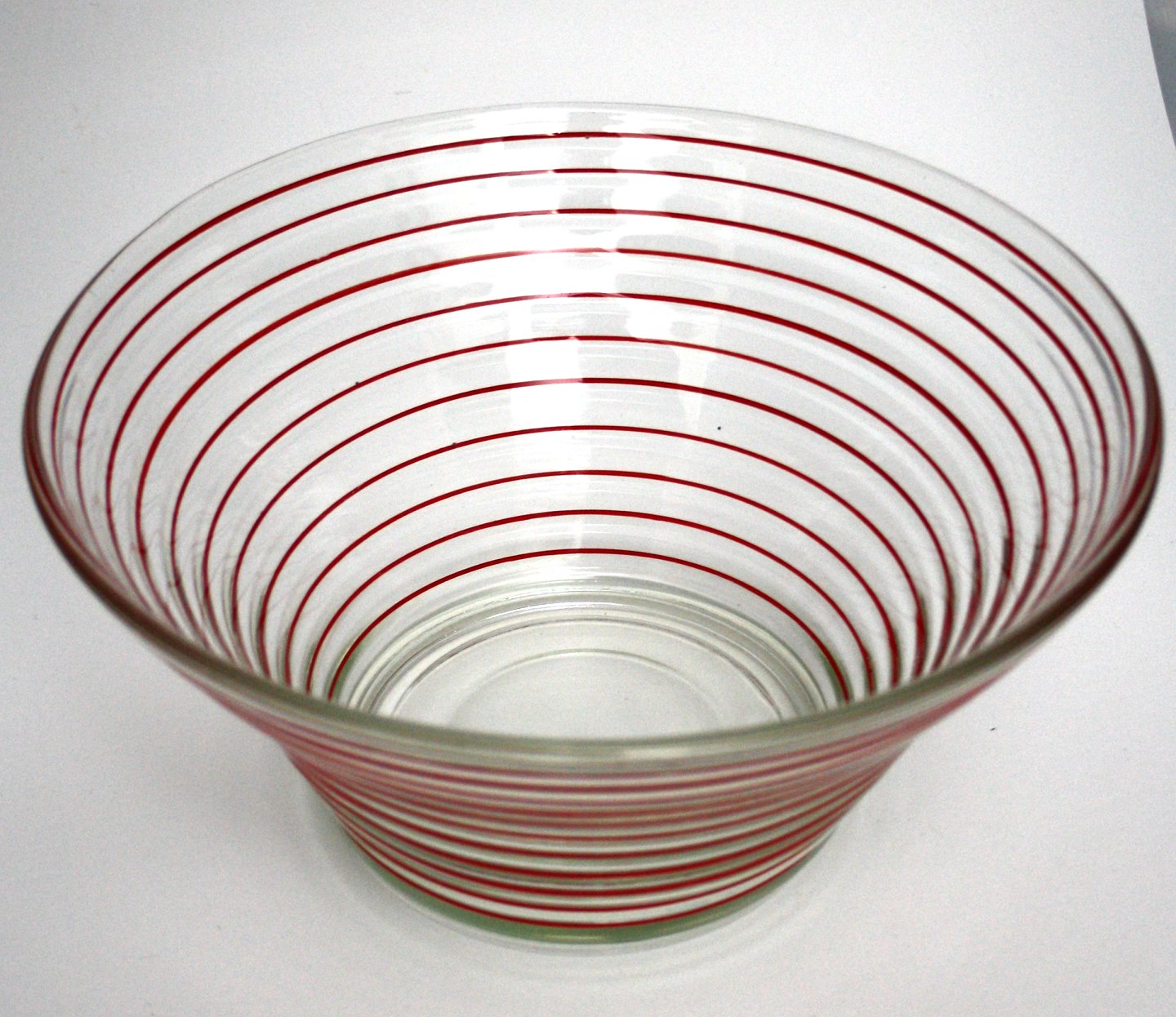 Holmegaard glasværk, Broksø fad, Stor skål, presset glas med røde striber. Designet af Jacob Bang i 1938. Højde 11,5-12 cm. Diameter 23-24 cm. Pris: 225 kr. stk. Lager: 3