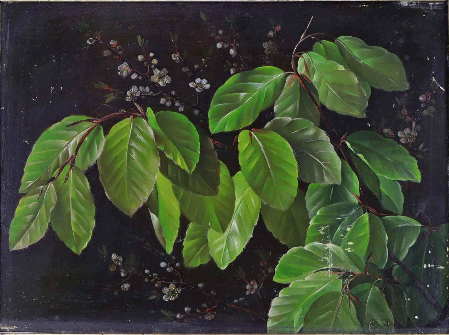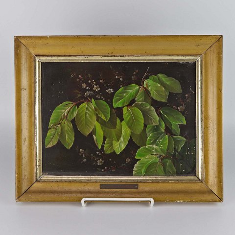 Gammel oliemaleri på plade i træramme med naturalistisk motiv af grønne blade og lyse æbleblomster på mørk baggrund. Maleriet er mærket 1906 på bagsiden