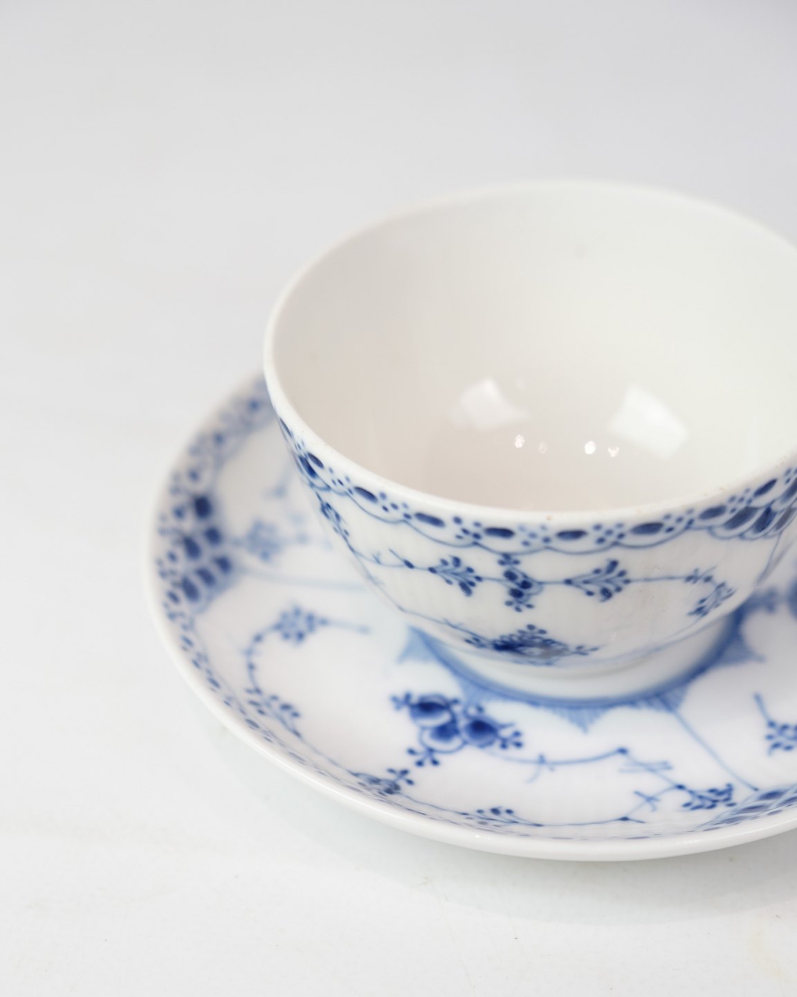 Tekop med underkop mærket nr. 1/713 fra Royal Copenhagen. 1. Sortering i halvblonde musselmalet design. Designet af Arnold Krog.