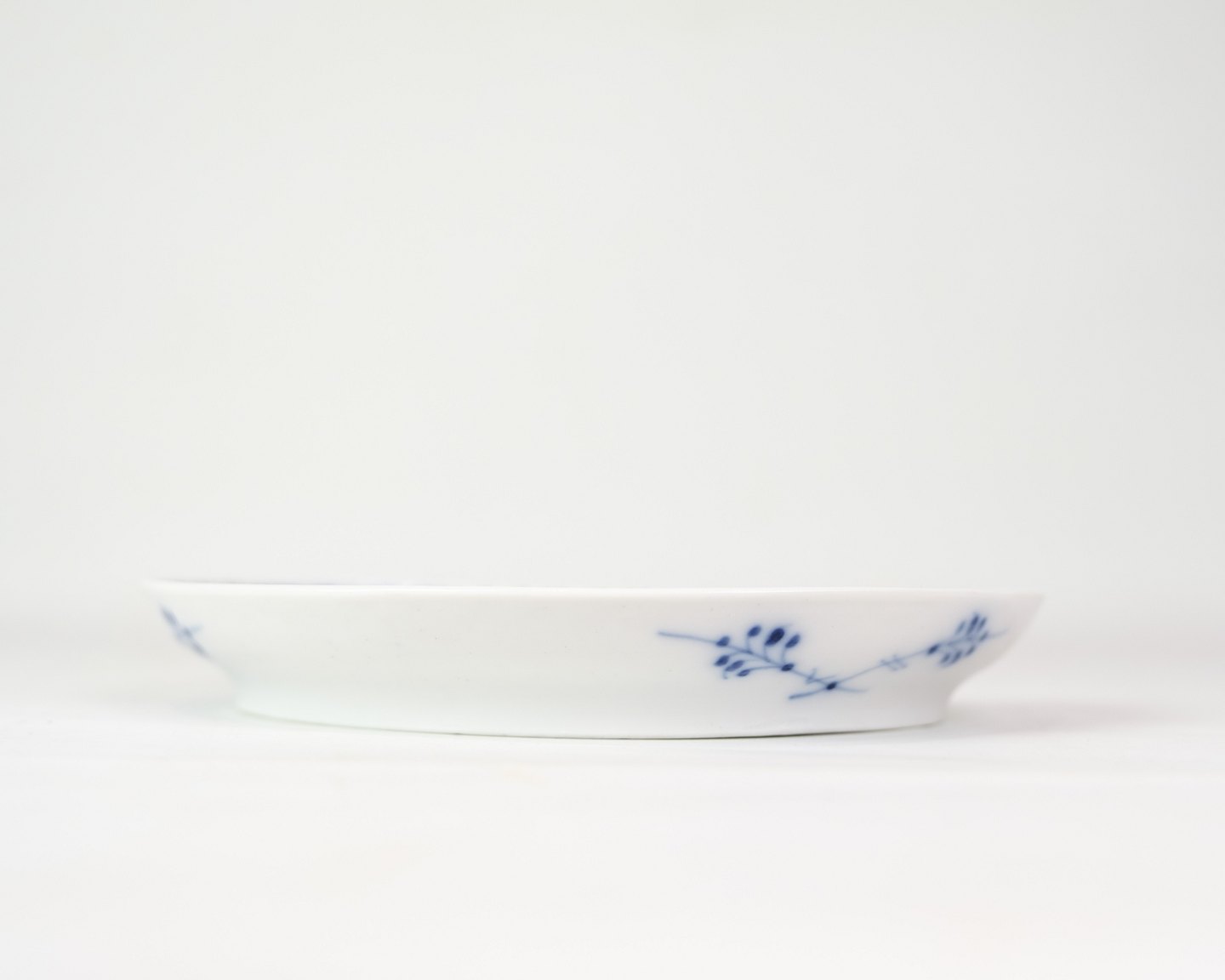 Halvmåne fad mærket 1/559 fra Royal Copenhagen. Fremstillet i porcelæn med musselmalet halvblonde design. Fadet er håndmalet i blå dekoration.