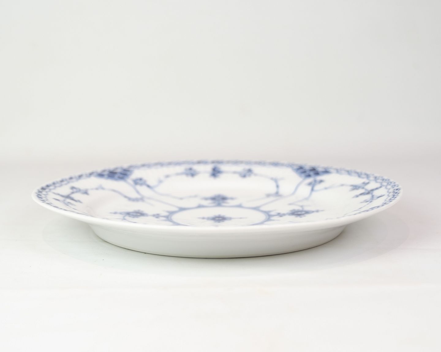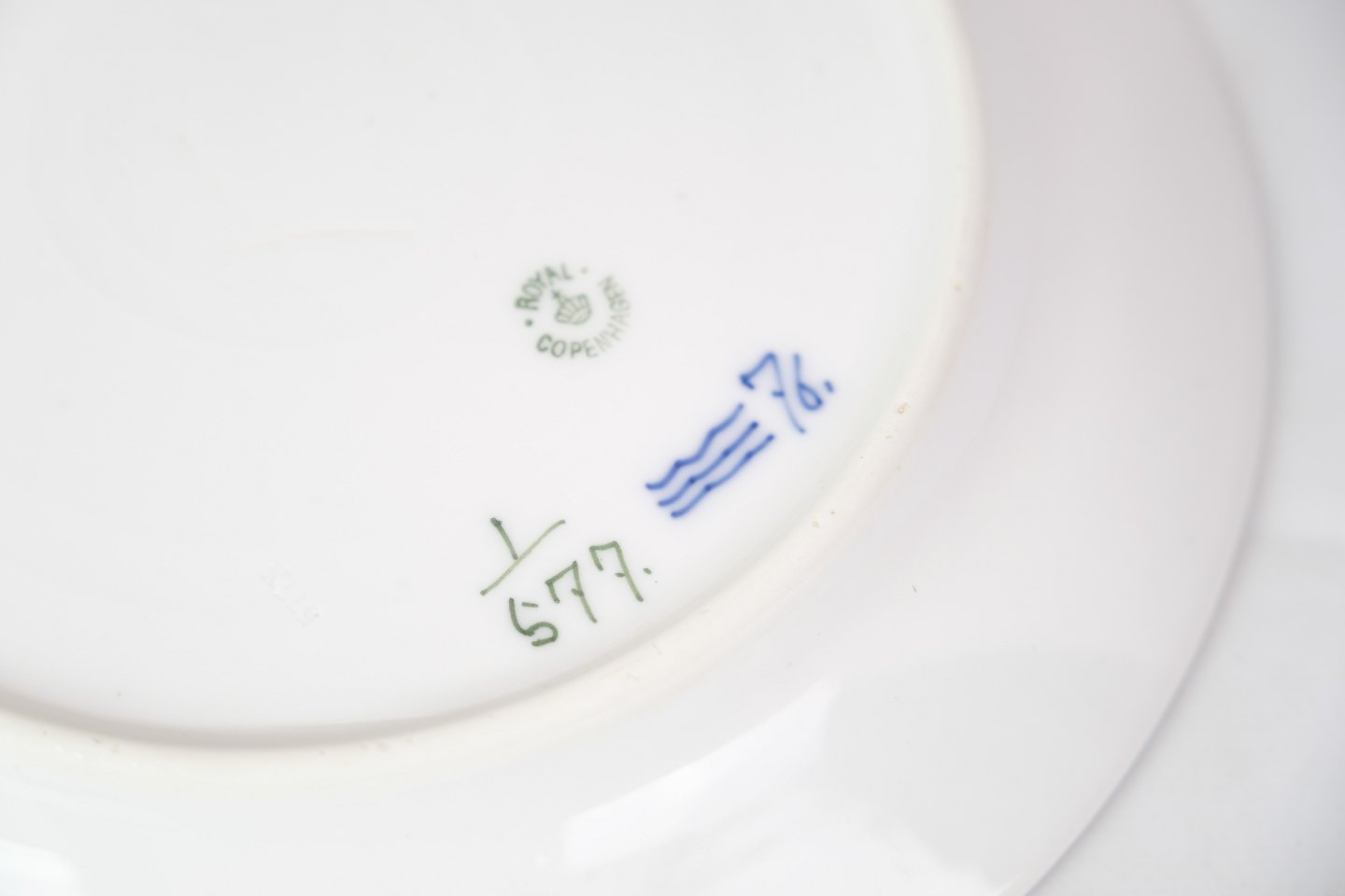 Middagstallerken mærket 1/577 fra Royal Copenhagen. Fremstillet i porcelæn med klassisk musselmalet halvblonde design. Håndmalet i blå dekoration.