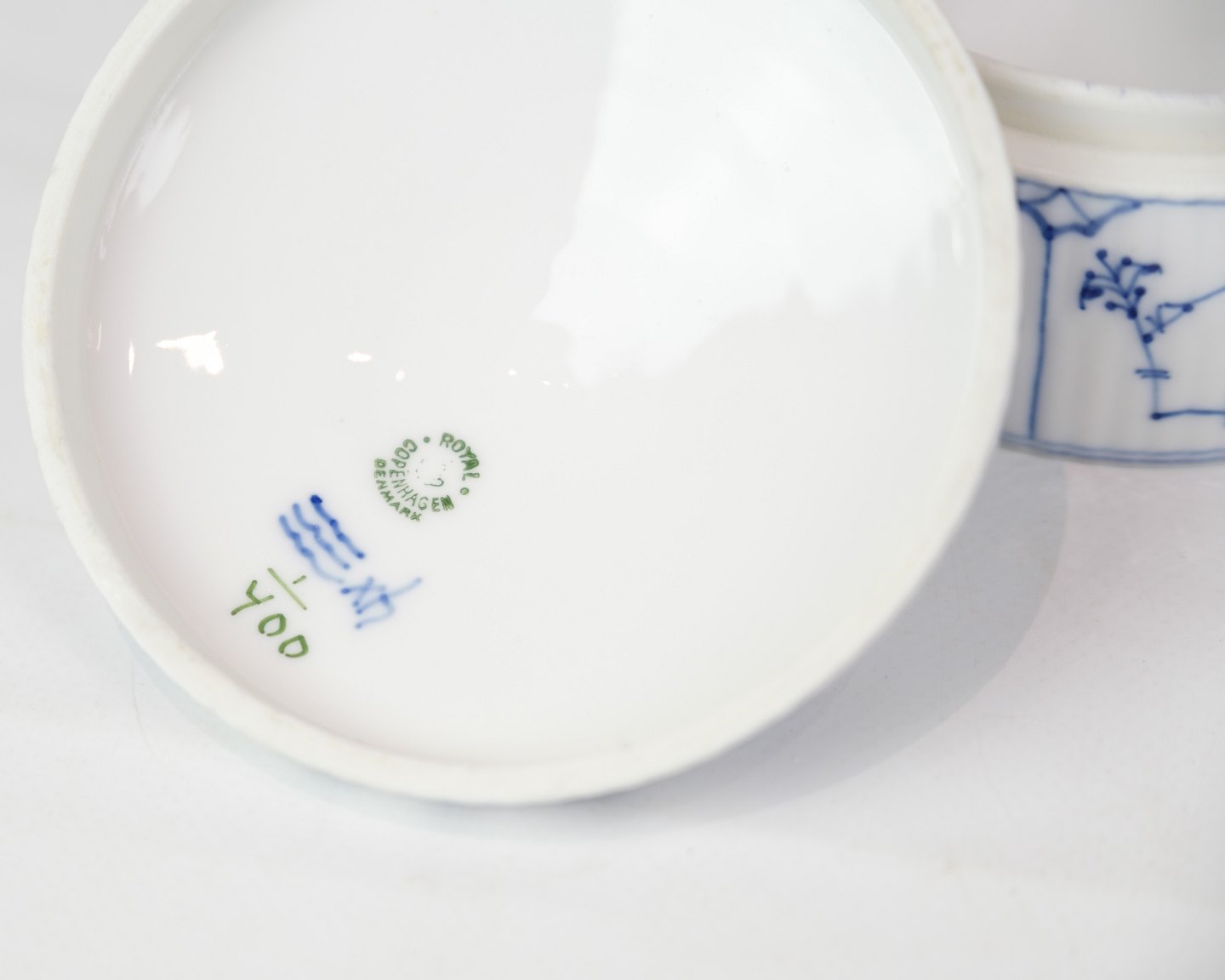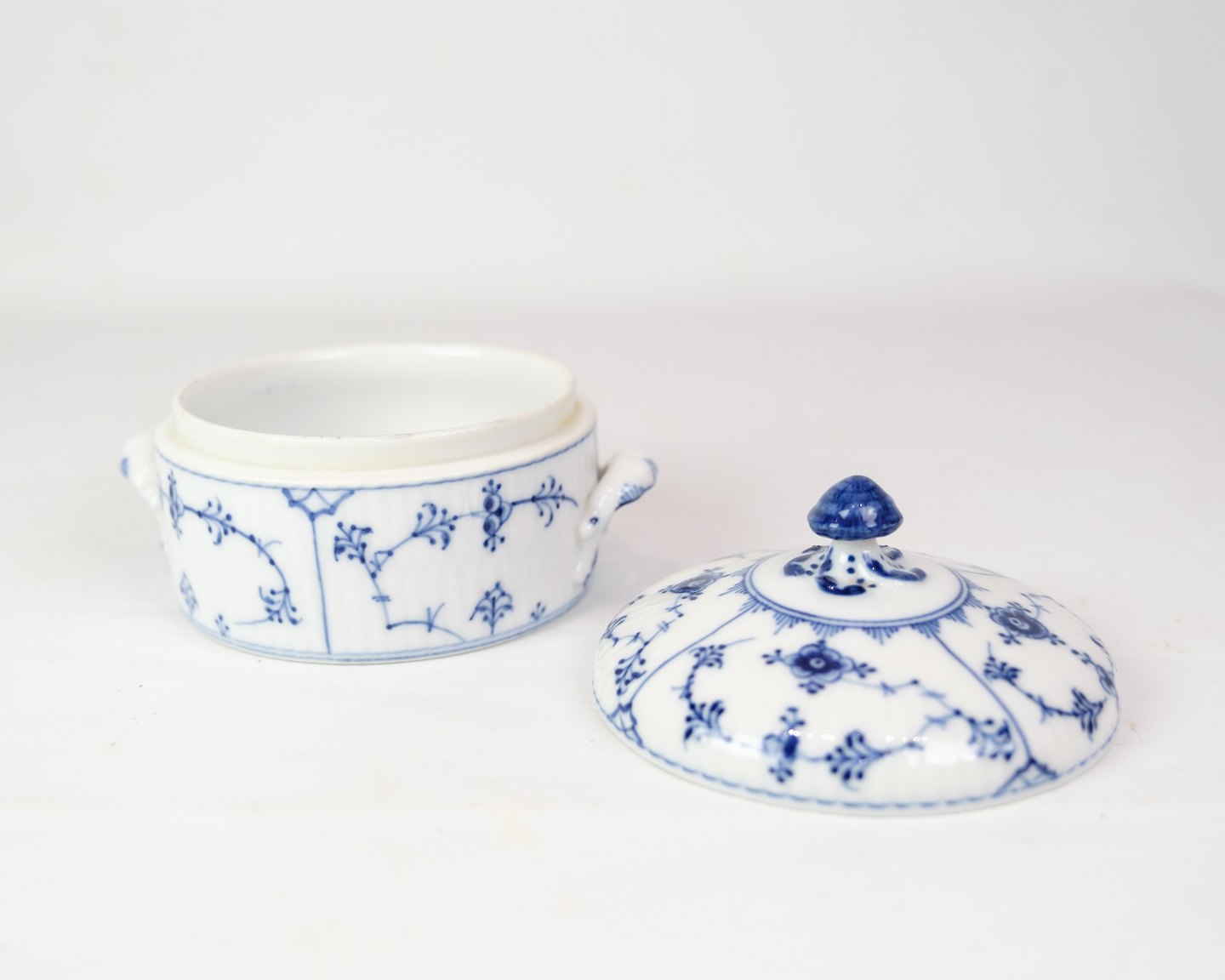 Smørskål med låg mærket 1/400 fra Royal Copenhagen. Fremstillet i porcelæn med Klassisk musselmalet riflet design. Håndmalet i blå dekoration.