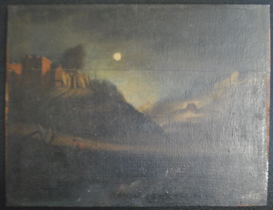 Ubekendt kunstner (18. årh.): Månelandskab med byer og mand. Olie på egepanel. Usigneret. 25 x 32 cm.
