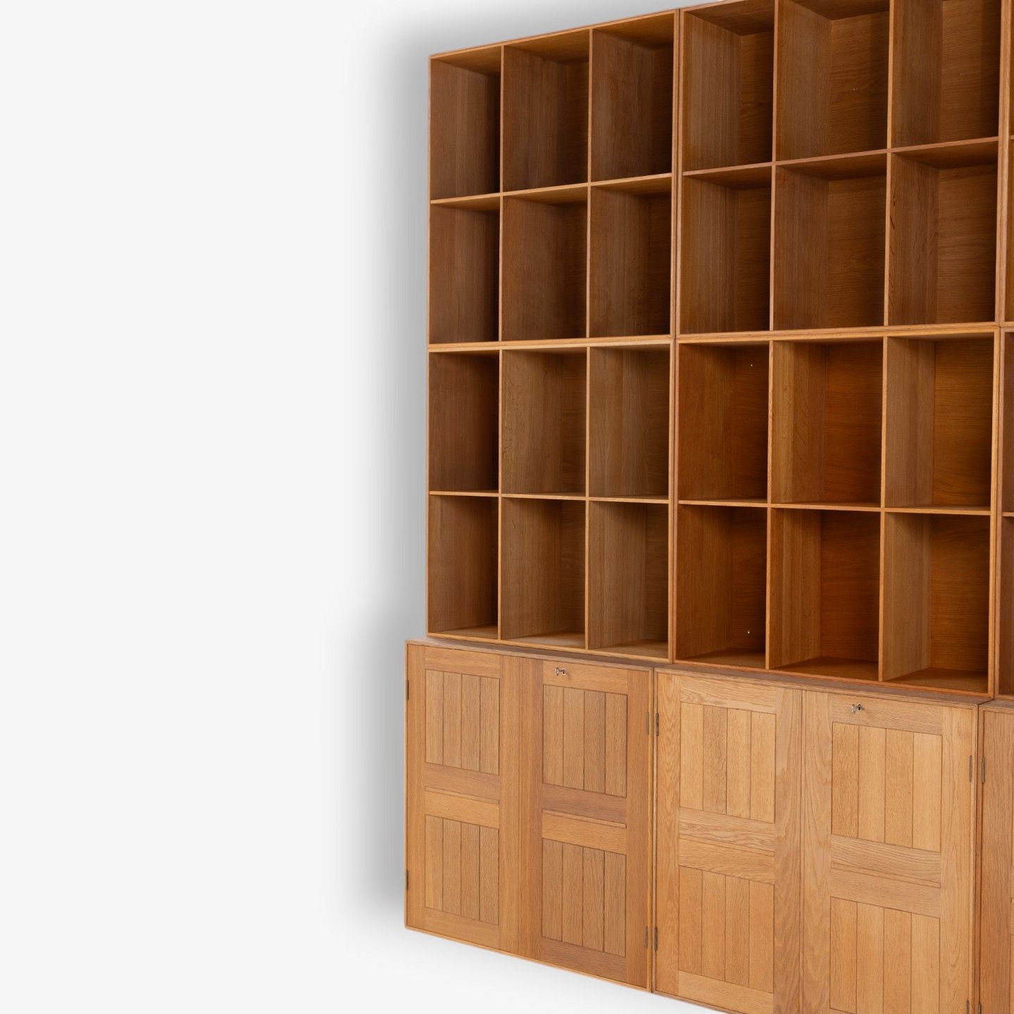 Sæt på tre skabe og seks bogkasser i patineret massiv eg.