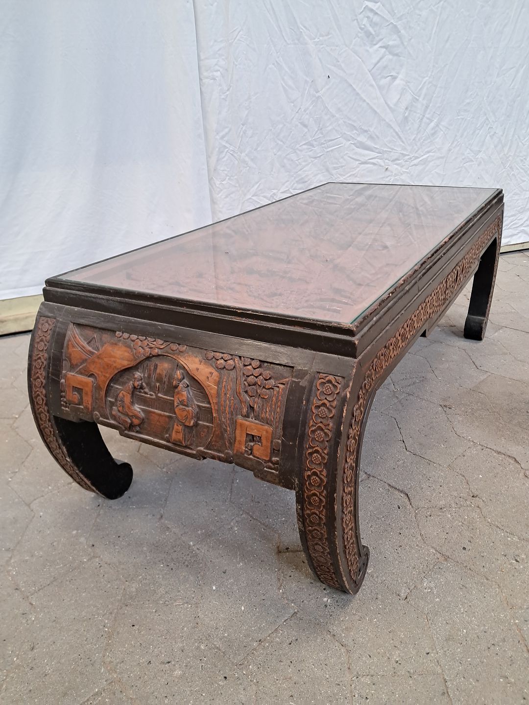 Pyntebord i massivt træ med glasplade, fra 1980erne.