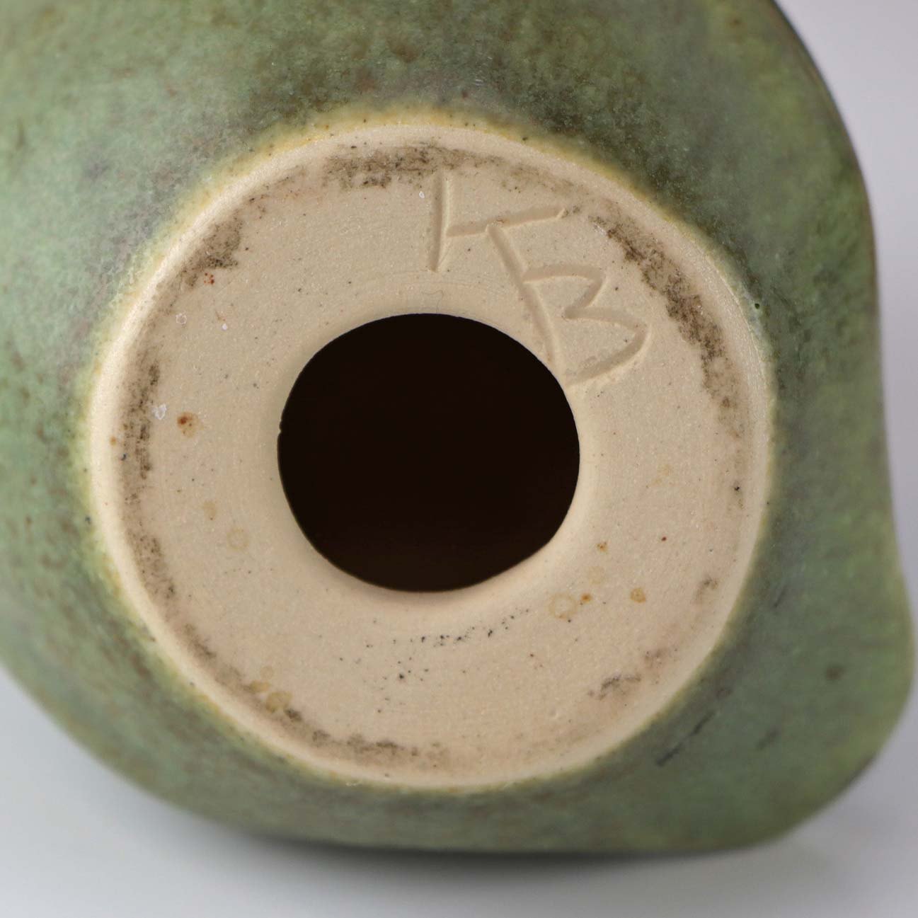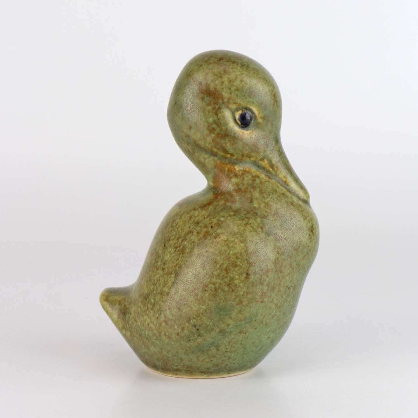 Figur i stentøj med grøn glasir og motiv af en ælling.