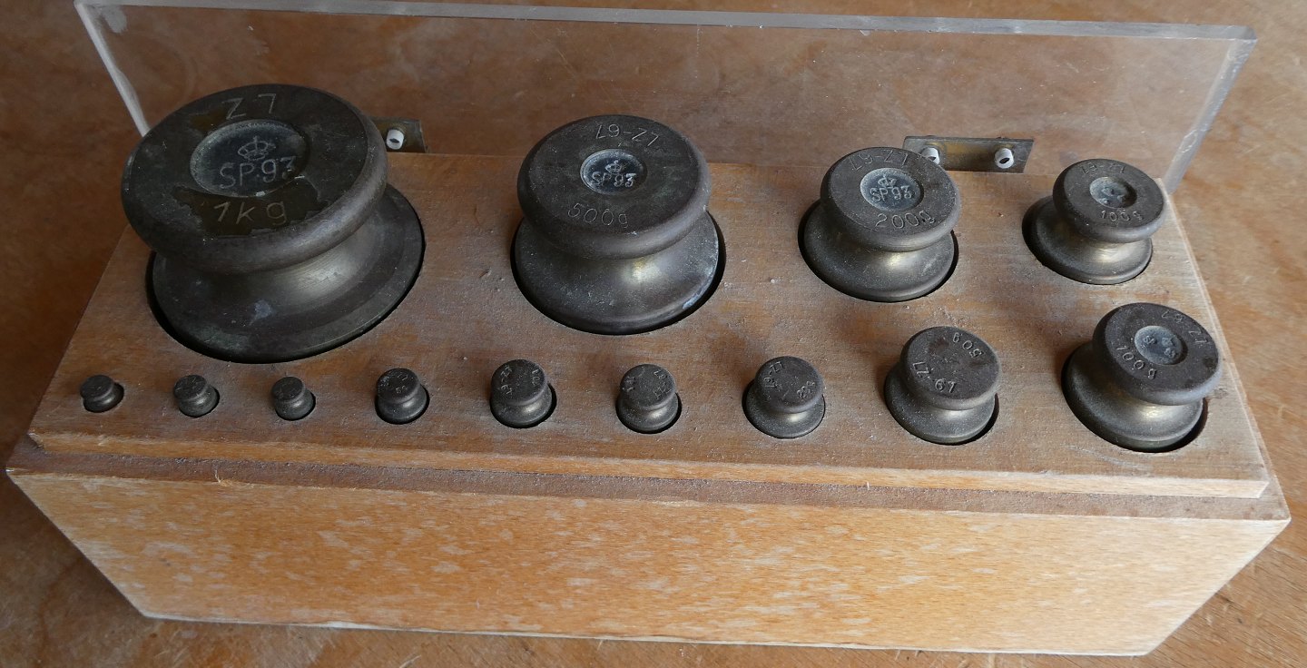 Vægtlodder i messing og i kasse, alle stemplet. I alt 13 vægtlodder fra 1kg ned til 1g.