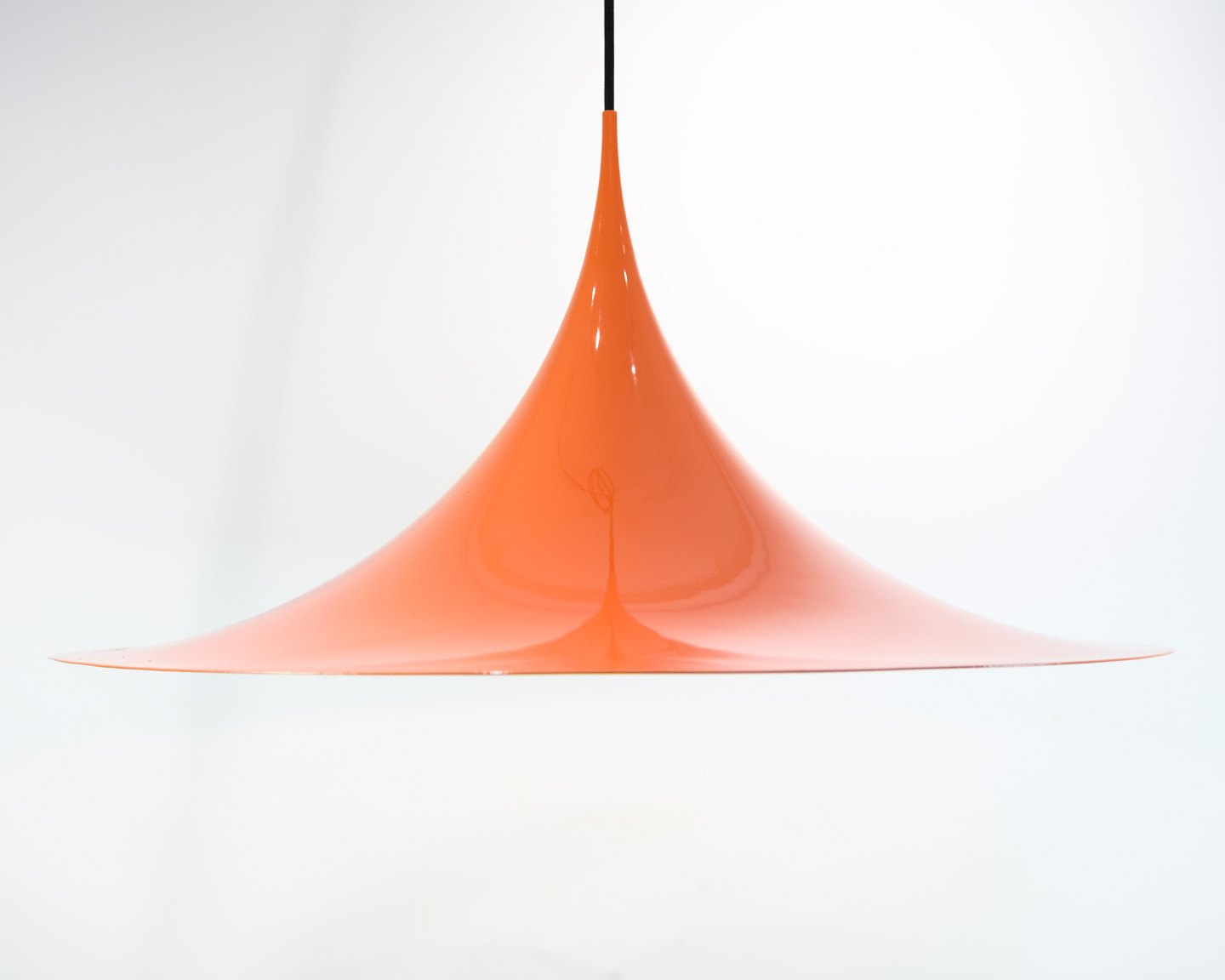 Stor trompet pendel i orange, designet af Claus Bonderup for Fog & Mørup i 1970’erne.