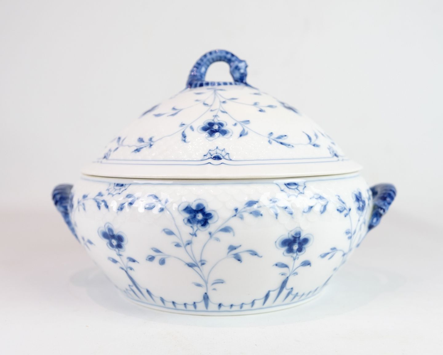 Terrin nr. 5 fra Bing & Grøndahl i klassisk musselmalet porcelæn. Dekoreret med håndmalet sommerfugl mønster og fine detaljer.