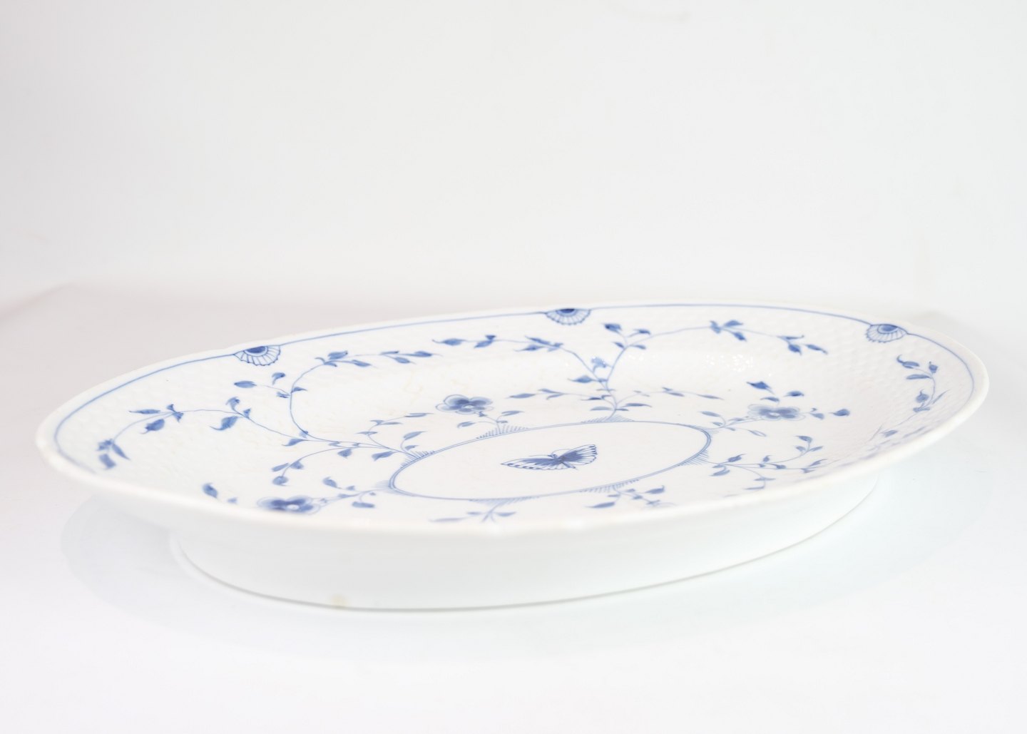 Stort ovalt fad, nr. 26, fra Bing & Grøndahl. Udført i porcelæn med håndmalet sommerfuglmotiv, med stempel i bunden.