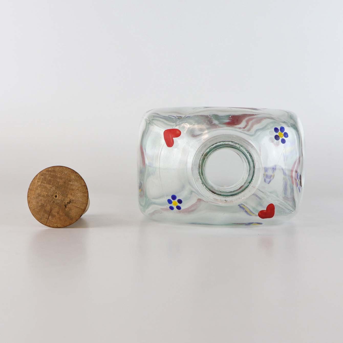 Kantine karaffel i klart glas med prop af træ fra år 1937-1957. Flasken er dekoreret med røde hjerter og blå blomster i emaljemaling.