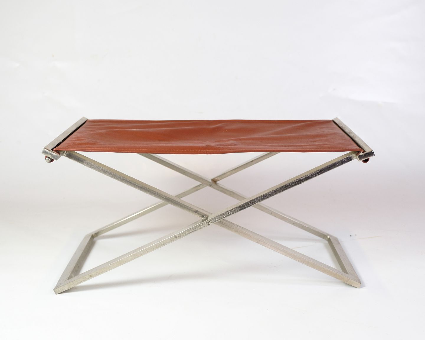 Skammel/taburet fra Michael Christensen, 1960’erne. Polstret med cognacfarvet læder og stel i børstet stål. Et stilrent eksempel på dansk design fra perioden.