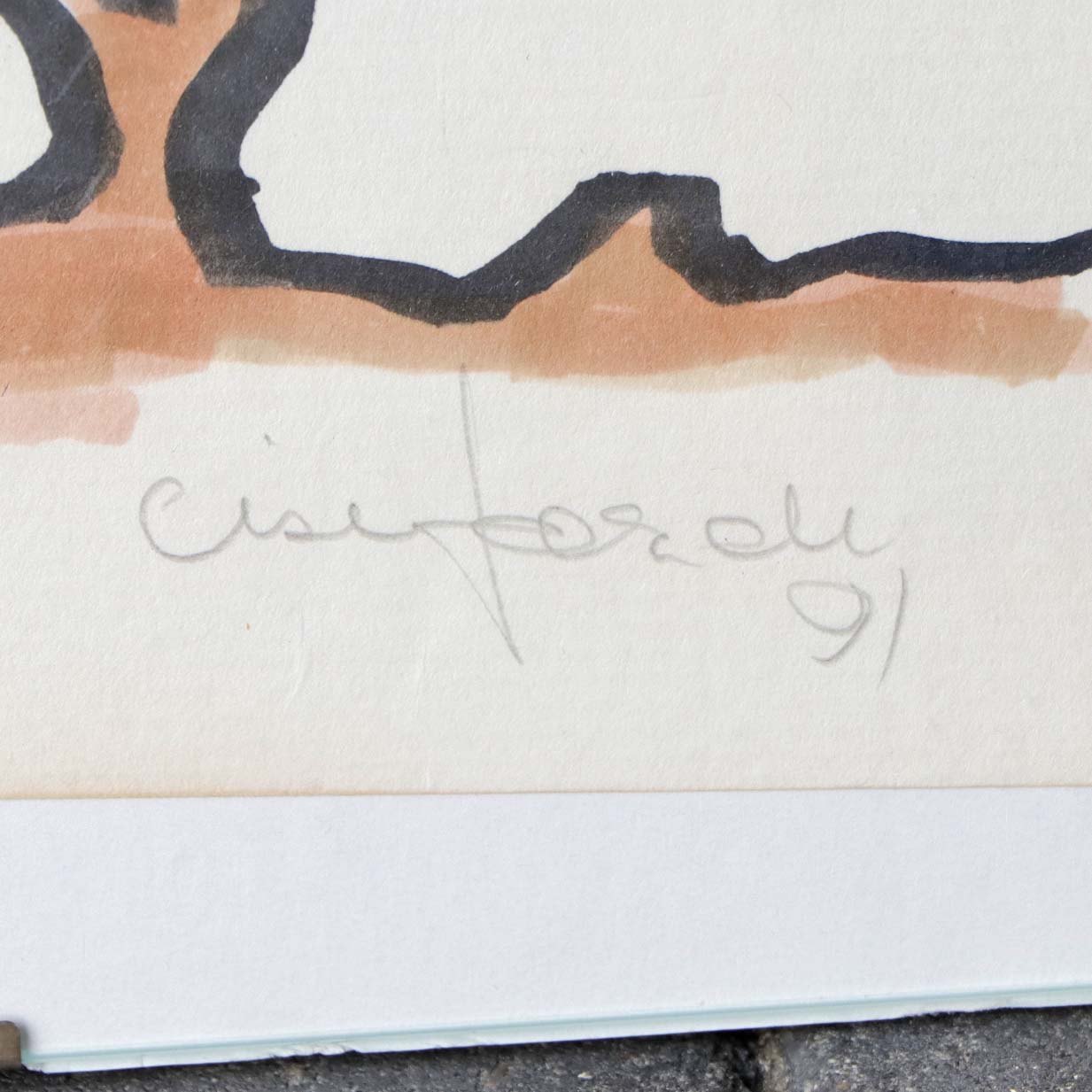 Indrammet tusch tegning i skifteramme med motiv af kvinde i et træ i sort, blå og lys brun streg. Dateret 1991