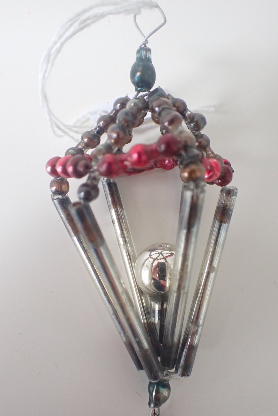 Øverst til venstre: Lygte sammensat af glasperler/-kugle og -stænger. 1930 - 1940. Højde: 8,5 cm. Pris: 250 kr.
