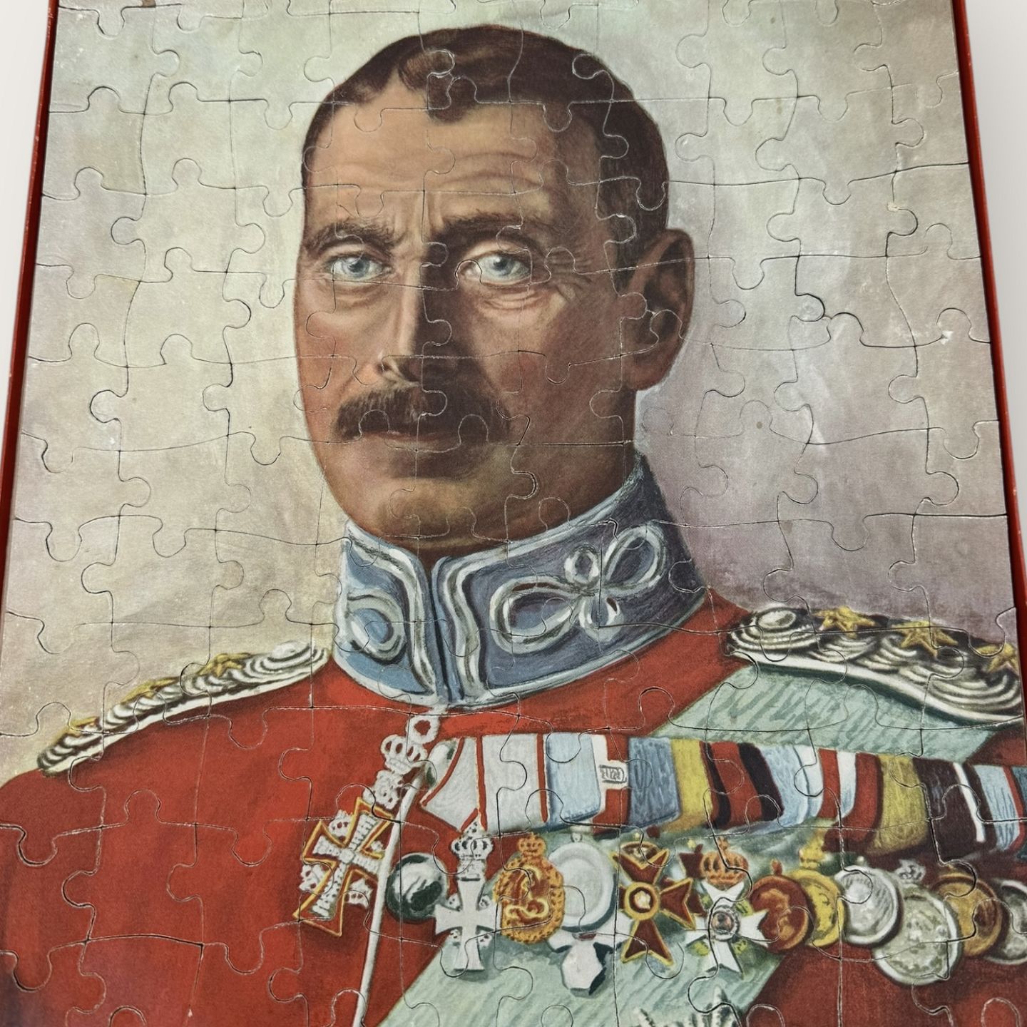 Christian X puzzle with 130 pieces, some wear on the lid, otherwise good used condition, dimensions: 33.5x27.5cm