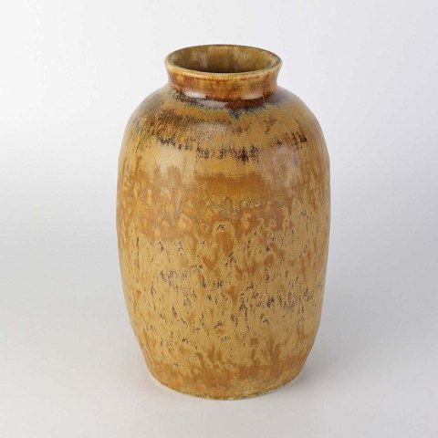 Vase i stentøj med glasering brune og gyldne nuancer.