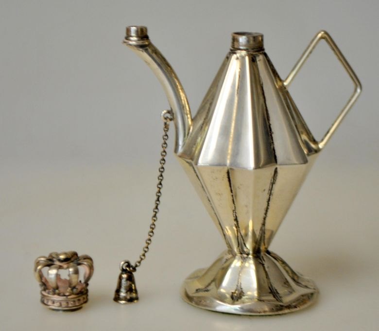 Hugo Grün lille olie lampe i sølv, 20. årh. København, Danmark. Stemplet: 835S H.Gr. Med låg i from af kongekrone. Med hank og tud. På udfyldt fod. H. 9 cm.